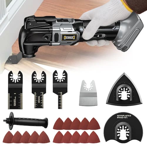 Ferramenta oscilante sem fio DIYtooLifz para Dewalt 20V (BATERIA NÃO INCLUÍDA) Especificação: Modelos compatíveis: Ferramentas elétricas oscilantes para Dewalt Baterias incluídas: Não são necessárias baterias:?Yes Voltagem: DC 20V Modelo: Sem escova Separe Liga/Controle de velocidade: Sim Tensão de força: DC 20V 6 Velocidade variável ajustável Esta ferramenta oscilante multiferramenta é compatível com Dewalt e possui 6 configurações de velocidade, variando das 8500 às 21h. Velocidades de vibração baixas (1-3 marchas) são ideais para polimento detalhado, enquanto altas velocidades de vibração (4-6 marchas) são normalmente usadas para cortar madeira e metal. Ângulo de oscilação de 4° A oscilação de grande ângulo de 4° oferece o melhor desempenho de corte e conforto para uso prolongado para realizar qualquer tarefa. Alça auxiliar A alça auxiliar da multiferramenta oscilante DIYtooliFZ pode ser ajustada de acordo com sua posição de operação (esquerda/direita). Pode aumentar a força de corte, estabilizar a posição e a direção do corte. Luz LED Esta luz LED embutida na serra oscilante foi projetada especificamente para trabalhar em ambientes escuros, proporcionando melhor visibilidade, especialmente em áreas com pouca luz ou pontos de difícil acesso. Sistema de proteção de ferramentas/baterias Proteção contra sobrecarga Proteção contra superaquecimento Proteção de baixa tensão Aplicação versátil Estes kits de lâminas multiferramentas para Dewalt incluem acessórios populares de corte e lixamento para ajudar a concluir uma variedade de projetos. Tarefas de drywall, restauração de janelas, reciclagem de móveis antigos, corte de tubos de PVC, remoção de carpetes/pisos/azulejos de banheiro, bloqueio de portas, raspagem de tinta e assim por diante. Kit de ferramentas elétricas oscilantes e lista de pacotes Ferramenta elétrica* 1 alça auxiliar* 1 lâmina de serra reta* Lâmina de serra de 3 segmentos* 1 raspador flexível* 1 suporte de lixa* 1 lixa * 15 manual do usuário* 1 nota: baterias não incluídas. - [Lembrete amigável] ---- 1. Esta ferramenta oscilante NÃO INCLUI nenhuma bateria, é apenas uma ferramenta simples. 2. A máquina de ferramentas elétricas oscilantes pertence à marca DIYtooliFZ, compatível apenas com as baterias Dewalt. - [Portátil e sem fio] Com esta ferramenta oscilante sem fio projetada para a bateria Dewalt de 20v (bateria não incluída), você pode experimentar a liberdade de trabalhar a qualquer hora e em qualquer lugar, sem o incômodo de cabos emaranhados e mobilidade limitada. - [Compatibilidade multiferramenta com bateria DeWalt 20V] Ferramenta oscilante sem fio Compatível com baterias de íon de lítio dewalt 20v DCB206 DCB205 DCB204 DCB181 DCB182 DCB200 DCB203 DCB205-2 DCB204-2 DCB206-2 e muito mais. (Nota: este produto não inclui bateria) - [Multiferramenta oscilante de 6 velocidades variáveis] Esta multiferramenta oscilante para DeWalt tem 6 configurações de velocidade variável que variam de 8500-21000 OPM. Motor sem escova potente recentemente atualizado com longa vida útil, eficiência energética e estabilidade. - [Luz LED e ângulo oscilante amplo de 4] A serra oscilante DIYtoolifz tem uma luz LED embutida, proporcionando melhor visibilidade, especialmente em áreas pouco iluminadas ou de difícil acesso, enquanto o ângulo de oscilação de 4° ajuda a cortar cantos e lacunas estreitas. - [Kit de ferramentas multifuncional e completo de 23 unidades] O kit de ferramentas oscilantes vem com acessórios de instalação rápida de lâmina sem ferramentas, ferramenta oscilante*1, alça auxiliar*1, lâmina de serra reta*3, lâmina de serra segmento*1, raspador flexível*1, suporte de lixa*1, papel de lixar*15.