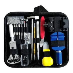 Conteúdo da Embalagem: 01 Chave para abrir relógios, fundo de rosca - de 3 pontos e 18 pontas 01 Espátula para abrir relógios, fundo de pressão. 01 suporte para fixação do relógio 01 Martelo 01 Pinça reta ponta fina 01 Ferramenta Saca pinos com 2 pontas 03 Saca pinos de pulseira 03 Chaves de fenda 01 estojo Marca: Wips