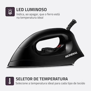 O Ferro a Seco Mondial FSN-55-B é prático e fácil de usar. Possui design anatômico confortável para passar e base de alumínio polido que desliza suavemente sobre os tecidos, distribuindo o calor de forma uniforme e rápida. Conta com sistema Salva Botões, para maior durabilidade e precisão na hora de passar, sem estragar suas roupas, além de seletor de temperatura e lâmpada piloto. Saiba mais sobre o FSN-55-B da Mondial: