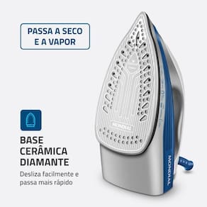 Salva Botoes: Protege os botoes e garante acabamento perfeito, o sistema autolimpeza, limpa o acumulo de minerais e residuos nas saidas de vapor, o reservatorio de 220ml proporciona maior autonomia e praticidade ao passar.