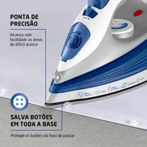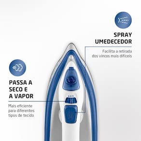 VAPOR CONTÍNUO E SPRAY: O ferro libera alta quantidade de vapor e possibilita remover os amassados das roupas. Além disso, o spray umedecedor é mais um aliado na tarefa e facilita a retirada dos vincos mais difíceis.