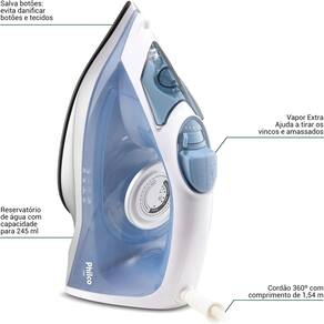 - Potência (W): 127V: 1200W / 220V: 2000W - Garantia (Dias): 360 - Estado: Novo - Modelo: PFV40 - Consumo (kW/h): 127V 1,2; 220V 2 - Cor: Azul e Branco - Material da base: Antiaderente - Funções: Vapor e Vapor Extra - Capacidade Reservatório de Água (ml): 245 - Comprimento cordão elétrico (metros): 1,50 - Tipo cordão elétrico: Giratório