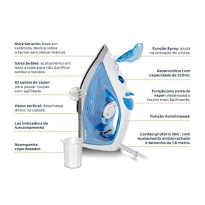• Base cerâmica • Função Vapor com 30g/min • Função jato extra de vapor • Função jato de água • 92 saídas de vapor • Vapor vertical • Capacidade reservatório de água de 320ml • Cordão emborrachado • Cordão giratório • Salva botões • Luz indicadora de funcionamento.