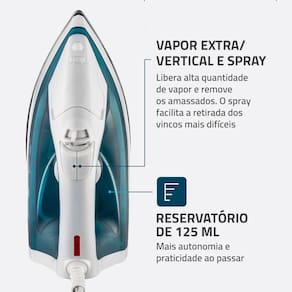 VAPOR EXTRA, VAPOR VERTICAL E SPRAY: O ferro libera alta quantidade de vapor, o que permite remover os amassados diretamente no cabide. Além disso, o spray umedecedor facilita a retirada dos vincos mais difíceis.