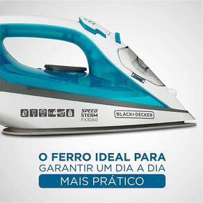 Ferro de Passar Roupa Black Decker a Vapor 1200w FX3060-B2 Base antiaderente COM ANTI GOTEJAMENTO Branco e Azul---------------------------------------------------------FERRO A VAPOR COM ANTI GOTEJAMENTO AZUL Sobre o produto: Com o revestimento Ceramic Gliss que desliza suavemente e permite mais agilidade ao passar suas roupas. Base antiaderente Ceramic Gliss com antigotejamento desliza suavemente no tecido sem grudar e conta com furos alongados especiais; Cabo anatômico embutido com giro de 360°, posição confortável para maior estabilidade do ferro ao apoiá-lo em pé; Vapor vertical permite tirar pequenos amassados das roupas direto do cabide. 1 ANO DE GARANTIA Características: Passa a seco e a vapor; Spray frontal; Ajuste da intensidade de vapor; Seletor para escolha do tipo de tecido; Sistema autolimpante; Tampa do reservatório com vedação; Sistema antigotejamento; Luz indicadora de funcionamento; Ponta afunilada para melhor alcance; Poupa botões em toda a lateral o ferro; Cabo anatômico com giro 360°; Potência: 1200W (127V) OU 2000W (220V).Ficha Técnica Capacidade 300 ml Material do recipiente / jarra / copo / coletor Plástico Comprimento do cabo elétrico (m) 1.75 Potência 1200 Watts Frequência 60 Hz Garantia 1 ano Consumo de energia 0.042 kw/h (220V) / 0.036 kw/h (127V) Temperatura 180°C até 200°C Quantidade de vapor 23 g/min Ean: 7899497695065 Ean: 7899497695072