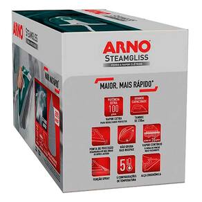 Caracteristicas: Marca: Arno Consumo Aproximado de Energia:346 Kw/h Capacidade de Água no Reservatório (Ml):230ML Linha:STEAMGLISS Comprimento do Cabo:1,8M Material Principal:Plastico e Base Antiaderente Níveis de Temperatura:5 NIVEIS Material da Base: PLASTICO E BASE ANTIADERENTE Potência:1200 W Tipo de Ferro de Passar:Vapor Etiqueta Nacional de Eficiência Energética (ENCE) A+