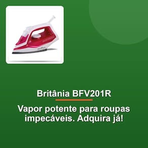 Descubra a eficiência e praticidade do Ferro Elétrico a Vapor Britânia BFV201R 220V. Com design moderno e ergonômico, ele facilita o manuseio e proporciona resultados impecáveis. O modelo BFV201R é ideal para quem busca rapidez e eficiência na hora de passar roupas, graças ao seu potente sistema a vapor que elimina até os vincos mais difíceis. Além disso, sua base antiaderente desliza suavemente sobre os tecidos, garantindo um acabamento perfeito sem esforço. Transforme sua rotina com um ferro que combina tecnologia e praticidade, tornando o cuidado com suas roupas uma tarefa simples e eficaz.