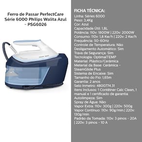 Ferro de Passar PerfectCare Série 6000 Philips Walita Azul - PSG6026