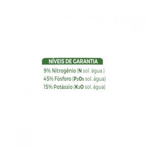 Natureza física: Farelado mineral misto Todos os nutrientes são solúveis em água. Maior relação soluto solvente: 2g/L Solubilidade em água a 20ºC • 390 g/LpH 5,6 - CE 2,33 mS/cmÍndice Salino 175 REGISTRO ESTABELECIMENTO MAPA: (EP) SP-003204-2REGISTRO PRODUTO MAPA: SP - 003204-2.00