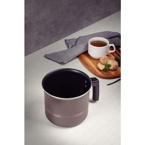 Fervedor Tramontina Sicília Antiaderente Avelã 14cm Praticidade e eficiência em sua cozinha com o fervedor Tramontina Sicília em alumínio com revestimento interno e externo em antiaderente Starflon Excellent avelã 14 centímetros de diâmetro 1,9 litros. Ideal para uso diário, ele é produzido em alumínio com revestimento interno e externo em antiaderente Starflon Excellent, características que juntas, aquecem os líquidos de maneira uniforme e evita que eles grudem em sua superfície. Seu cabo é em baquelite antitérmico, material que proporciona um manuseio mais e confortável, pois não aquece. O fervedor ainda é muito fácil de limpar e pode ser levado à máquina de lavar louças, otimizando seu dia a dia! Recomendações de Uso: A capacidade volumétrica máxima para cozimento é de 3/4 da capacidade total da peça.Posicione o cabo do utensílio voltado ao centro do fogã fogões com grade, centralize a peça e alinhe o cabo com a ílios quentes devem estar fora do alcance das crianç produto não pode sofrer modificaçõ do primeiro uso, lave com esponja macia, sabão neutro ou detergente lí de secar, unte a área interna com óleo ou gordura e leve ao fogo por um ou dois minutos. Deixe esfriar e lave utensílio Starflon está pronto para uso com ou sem gordura, sempre em fogo baixo ou médio (nunca superior a 260C).Para mexer os alimentos use somente utensílios de silicone, nylon ou madeira.Limpeza: Evite a imersão do utensílio quente em água utilize produtos abrasivos na deixar queimar alimentos, umedeça a área e reserve até que possa remover os resíduos grudados com esponja e sabã descarte do produto e embalagem siga as orientações de reciclagem produto não necessita de manutenção, apenas limpeza. Informações Adicionais: