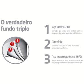 - O fundo triplo (aço inox + alumínio + aço inox) distribui o calor uniformemente, proporcionando um cozimento mais rápido e uniforme, economizando energia e deixando os alimentos aquecidos por mais tempo.