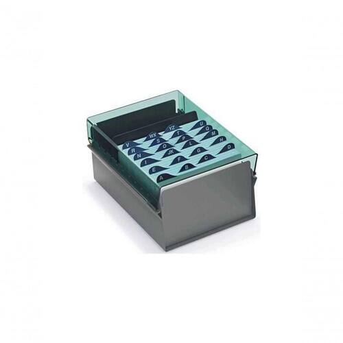 Fichário com corpo em aço na cor grafite, com tampa em poliestireno em cores diversas. Possui capacidade para até 500 fichas tamanho 5"X 8". Contém divisória de plástico para auxiliar equilíbrio dos cartões no fichário.