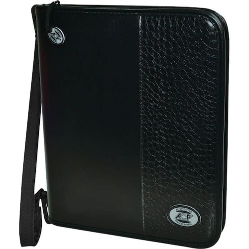 Fichário completo com zíper, alça, folhas pautadas e divisórias plásticas.