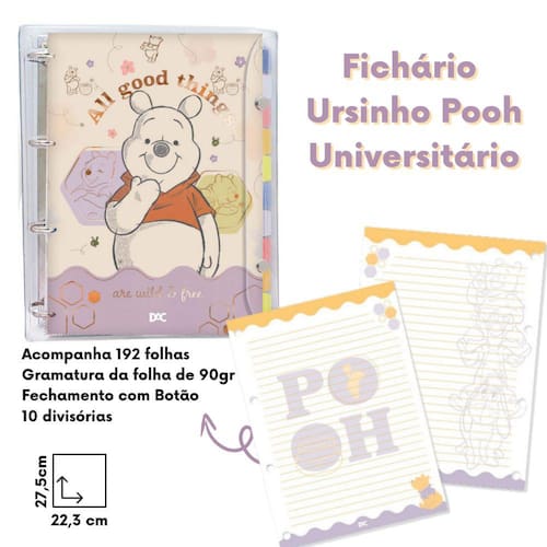 1 Fichário com 192 folhas decoradas, 10 divisórias plásticas, botão de fechamento e placa em plástico rígido para estruturação.