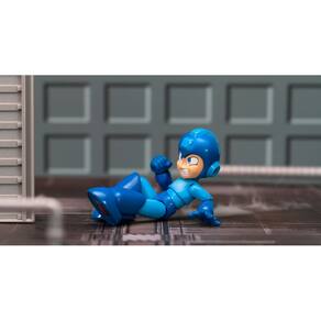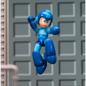 - Figura detalhada do Mega Man com traje de combate azul autêntico, capacete e canhão de braço.