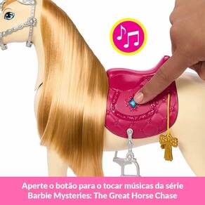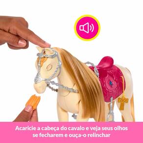 Figura Eletrônica - Barbie Mysteries - Cavalo com Som - Mattel: Tornado, o amado cavalinho da série Barbie Mysteries: The Great Horse Chase, ganha vida e entra na brincadeira como um cavalo de brinquedo interativo com mais de 20 sons e muitas maneiras de brincar — desde alimentar, até atuar e pentear. Este cavalo da Barbie dança, pisca os olhos, toca músicas inspiradas no programa e faz sons divertidos como relinchos, mastigações, galopes e muito mais. Acessórios como troféu, comida, escova e balde de alimentação contribuem para que a imaginação das crianças ganhe asas seu novo amigo cavalo, Tornado! Detalhes: • Este cavalo para bonecas Barbie vem com 12 peças, incluindo maças, cenouras, comida para cavalos, escova, balde de alimentação, concha, troféu, grampos de cabelo, escova e acessório para o cabelo. • Com tantas características divertidas, ele pode se mover e reagir a mais de 20 sons diferentes de cavalo • Este cavalo da Barbie dança, pisca os olhos, toca músicas inspiradas na série e faz sons divertidos como relinchos, mastigações, galopes e muito mais. • Puxe as borlas para ver o cavalo dançar! • Aperte o botão na sela para ouvir músicas inspiradas no show • Ajude o cavalo a fazer uma reverência para sons de alegria! • Para encenar momentos de carinho, acaricie a cabeça do cavalo e veja seus olhos se fecharem e ouça-o relinchar • Cuide e estilize o cavalo com o pente e adoráveis grampos de cabelo, extensões e acessórios Informações: • Produto: Cavalo Barbie Mysteries Com Som, Música e Acessórios • Marca: Mattel • Coleção: Barbie • Serie: Barbie Mysteries - The Great Horse Chase • Tipo: Figura Interativa com Acessórios • Categoria: Bonecas e Cia • Conteúdo: - 01 Cavalo articulado com sons e música - 01 acessório de cabelo em forma de rosa - 01 colher - 01 recipiente de alimentação - 01 pilha de grãos - 01 conjunto de cenouras - 01 conjunto de maçãs - 01 troféu - 01 pente - 01 escova - 03 grampos de cabelo • Recomendação: para crianças a partir de 03 anos de idade Especificações: • Referência: HXJ42 • Código de Barras: 194735231010 • Embalagem (C x A x L): 38.2 x 32.5 x 9.5 cm • Embalagem (Peso): 0.970 kg • Material / Composição: Plástico • Funcionamento: 03 pilhas AG13/LR44 (inclusas) • Registro: 005986/2021 • Certificado: Órgãos Autorizados - OCP´S (Organismos de Certificação de Produtos) Aviso: • As imagens são meramente ilustrativas • Os pesos, tamanhos e medidas são aproximados • As cores e estampas dos produtos podem ter variações • As informações são de responsabilidade do fabricante ou fornecedor