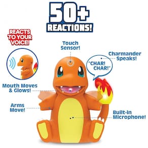 A figura eletrônica My Partner Charmander é um brinquedo interativo que utiliza sensores de toque e um microfone integrado para responder à voz e aos estímulos da criança com movimentos, luzes e sons temáticos de Pokémon. O personagem movimenta braços e boca, acende a chama da cauda e emite efeitos sonoros característicos, permitindo simular expressões de alegria, irritação, cansaço e ações de ataque inspiradas na série animada.