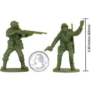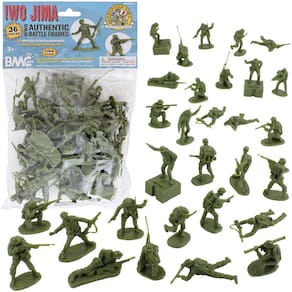 PRODUTO INTERNACIONAL. O Conjunto American Hero Collector Series da BMC Toys apresenta a Batalha de Iwo Jima, com 36 peças de plástico de soldados da Marinha dos Estados Unidos em oliva monótona. Com excelente detalhe e quase nenhum piscante, as figuras têm até 2,45 polegadas de altura e são feitas de plástico rígido e durável