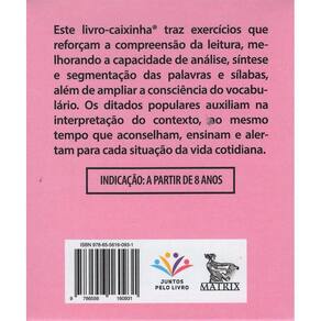 Este livro-caixinha® traz exercícios que reforçam a compreensão da leitura, melhorando a capacidade de análise, síntese e segmentação das palavras e sílabas, além de ampliar a consciência do vocabulário. Os ditados populares auxiliam na interpretação do contexto, ao mesmo tempo que aconselham, ensinam e alertam para cada situação da vida cotidiana. Indicação: a partir de 8 anos