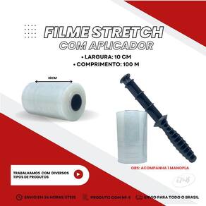 R: O filme stretch possui largura de 10cm e comprimento de 100m.