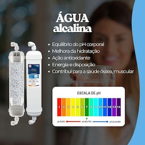 Filtro de água para torneira com 3 estágios de filtragem: polipropileno, carvão ativado em bloco e elemento filtrante alcalino. Reduz cloro, odores e sabores, retém partículas sólidas e alcaliniza a água. Inclui carcaças, mangueiras, conectores e torneira.Bica móvel