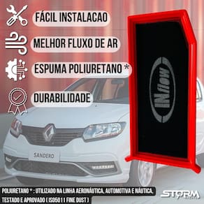 Filtro ar esportivo inflow renault sandero 1.0 2017 a 2022 Características: - desenhado para melhorar a eficiência do veículo; - não descartável lavável e 100% reciclável; - vida útil de 2 anos ou 60.000km; - redução da emissão veicular; - redução na quantidade de trocas de filtro de ar convencional de papel ecologicamente correto ; - espuma poliuretano performance de filtro ar esportivo ; - não sofre com ação de umidade e chuva; - óleo utilizado: óleo mineral vaselina líquida neutra - modelo urbano, podendo ser utilizado em ruas de terra com manutenção antecipada. Na utilização por longos períodos em estradas não pavimentadas, as condições de limpeza do filtro devem ser avaliadas a cada 5 mil km.