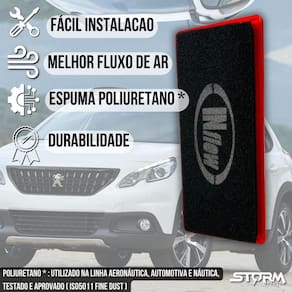 Filtro ar esportivo peugeot 2008 1.6 thp turbo 2019 a 2023 Características: - desenhado para melhorar a eficiência do veículo; - não descartável lavável e 100% reciclável; - vida útil de 2 anos ou 60.000km; - redução da emissão veicular; - redução na quantidade de trocas de filtro de ar convencional de papel ecologicamente correto ; - espuma poliuretano performance de filtro ar esportivo ; - não sofre com ação de umidade e chuva; - óleo utilizado: óleo mineral vaselina líquida neutra - modelo urbano, podendo ser utilizado em ruas de terra com manutenção antecipada. Na utilização por longos períodos em estradas não pavimentadas, as condições de limpeza do filtro devem ser avaliadas a cada 5 mil km.