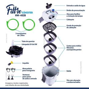 Itens inclusos na embalagem: 1 Cabeçote com bomba e impeller 1 Suporte para entrada e saída de água 1 Grade de proteção do cabeçote 1 Lâmpada UV germicida de 9W 3 Cestas para mídias 3 Pedaços de perlon 1 Balde com presilhas 2 Ventosas para suporte dos canos 2 Abraçadeiras 2 Mangueiras de 1,90m 1 Cano de sucção 1 Grade de proteção para sucção 2 Extensores para cano de sucção 1 Saída flauta desmontável