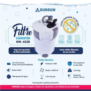 Especificações técnica: Marca: Sunsun Modelo: Sunsun HW-402B Potência: 18W Voltagem: escolha a voltagem na lateral do anúncio Vazão: 1000 L/h Hmax: 1.4m altura máxima que a bomba consegue elevar a água Lâmpada: UV UV-C ultravioleta germicida 9W - PL 2 pinos Indicado para aquários de até: 200L Medidas: 24 x 39 x 24cm larg x alt x profund Tamanho do fio: 140 cm Peso: 2,610 Kg
