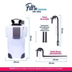 DICAS: 1 - Para manter um bom desempenho da bomba e da filtragem, realize a limpeza do filtro e das mídias a cada 7 dias. Lavar apenas com água corrente. 2 - Insira as mídias mais pesadas nas camadas de baixo cerâmica, carvão, Matrix, Zeolite etc , assim você garante maior estabilidade ao cânister e evita que ele tombe. 3 - Faça um mix de mídias para que você obtenha uma tripla filtragem: química, biológica e mecânica.
