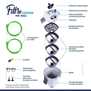 Itens inclusos na embalagem: 1 Cabeçote com bomba e impeller 1 Suporte para entrada e saída de água 1 Grade de proteção do cabeçote 3 Cestas para mídias 3 Pedaços de perlon 1 Balde com presilhas 2 Ventosas para suporte dos canos 2 Abraçadeiras 2 Mangueiras de 1,90m 1 Cano de sucção 1 Grade de proteção para sucção 2 Extensores para cano de sucção 1 Saída flauta desmontável