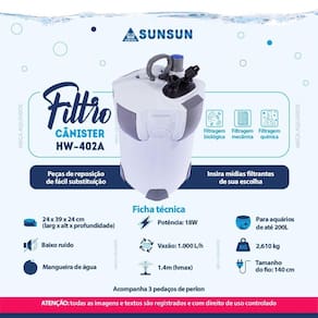 Os filtros cânister Sunsun, são ideais para quem busca um equipamento prático, de fácil manutenção, confiável e de ótimo custo-benefício. Sua principal característica é a possibilidade de escolha das mídias filtrantes que serão utilizadas de acordo com a necessidade do seu aquário ou lago, além disso, possui saída tipo flauta que auxilia na oxigenação na água.