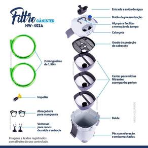 Itens inclusos na embalagem: 1 Cabeçote com bomba e impeller 1 Suporte para entrada e saída de água 1 Grade de proteção do cabeçote 3 Cestas para mídias 3 Pedaços de perlon 1 Balde com presilhas 2 Ventosas para suporte dos canos 2 Abraçadeiras 2 Mangueiras de 1,90m 1 Cano de sucção 1 Grade de proteção para sucção 2 Extensores para cano de sucção 1 Saída flauta desmontável