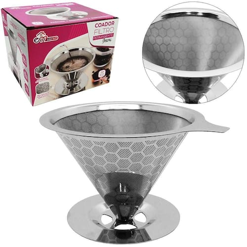 Filtro / coador de café de inox com base nº102 14,5x9x12,4 Informações adicionais: Ean: 7908486100470 Validade: indeterminada Tamanho aproximado do filtro: 14,5x9x12,4cm de Tamanho aproximado da caixa: a:10,5xl:13cm Peso aproximado: 150g Tipo de produto: filtro / coador de café com base numero 2 na caixa Cor: prata Composição: inox