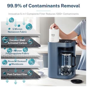 O projeto de economia de espaço do filtro 5 em 1 oferece filtragem de cinco estágios, usando um filtro patenteado para remover 99,9 dos contaminantes da água. A unidade de filtragem de água é certificada pela SGS e a membrana RO interna foi testada separadamente e certificada pela NSF ANSI 58. Além disso, o filtro de tamanho menor torna o perfeito para 12 pessoas.