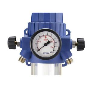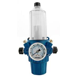 Filtro para controle de pressão de alta vazão com válvula incorporada, duas saídas reguláveis de 1/4"BSP (macho), entrada 3/8 BSP Fêmea, manômetro calibrado até 150 Lbs/pol2. Dreno manual. Sistema centrífugo de filtragem com refil de 5 micra, copo transparente.