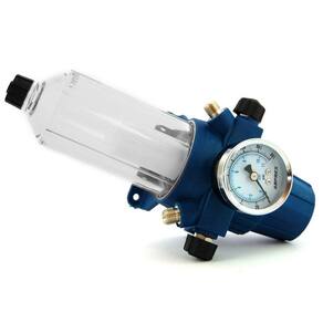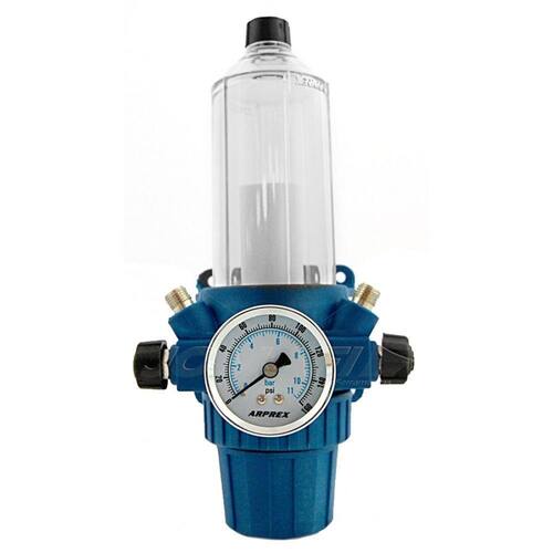 Filtro regulador para ar comprimido que elimina a presença de óleo, impurezas e partículas que possam prejudicar uma perfeita pintura, regula a saída mantendo uma pressão e vazão constantes, permitindo uma vida útil mais longa do aparelho e aplicações mais uniformes e economiza energia, permitindo ao compressor espaços mais longos para recarga em virtude do controle de saída de ar.