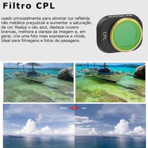 Filtro de lente cpl para drone dji mini 4 pro Filtro de lente cpl para drone dji mini 4 pro O filtro cpl da sunnylife foi projetado especificamente para o drone dji mini 4 pro, têm como principais funções eliminar a luz não metálica refletida e que pode acabar prejudicando as imagens, aumentar a concentração de cores para realçar o azul do céu, destacar as nuvens brancas e tornar a imagem mais impressionantes. Ele também consegue melhorar a claridade das imagens e, em geral, criar fotos e vídeos mais expressivos e vívidos. É frequentemente para fazer imagens através de vidro, água e cenários subaquáticos. O cpl pode ser ajustado e a moldura dourada pode ser girada de acordo com suas necessidades para atingir requisitos de polarização satisfatórios, sendo indicado para para céus, águas e folhagens. Além de melhorar a sua experiência ao fotografar e filmar, o filtro também fornece proteção extra para a câmera do drone, pois a sua estrutura é feita de liga de alumínio, com design antiderrapante para facilitar ainda mais a instalação e a remoção. E seu design ultraleve não sobrecarrega o gimbal. Também conta com revestimento multicamada de dupla face que garante um protetor à prova d&39;água, à prova de óleo, à prova de poeira e anti-riscos de primeira classe, dando a você a liberdade de experimentar diferentes possibilidades criativas. Melhore drasticamente esses elementos naturais, dando às imagens uma aparência melhor Principais vantagens: - leve - prático - fácil de instalar/remover - proteção extra Modo de usar: 2. Alinhe com os orifícios e gire o filtro no sentido horário 3. Pronto Dados técnicos: Marca: sunnylife Modelo: n4p-fi724 Material: alumínio + vidro óptico Peso da embalagem: 0.7g Compatibilidade: Compatível com drone dji mini 4 pro Itens inclusos: 1x filtro de lente cpl 1x caixa de transporte Drone não incluso Imagens meramente ilustrativas de 90 dias após o recebimento do produto Esta é válida para todo o território nacional, e ela cobre defeitos de fabricação. Para maiores informações consulte o site do fabricante ou contate-nos pelos nossos canais de atendimento. Por que comprar seu equipamento com a proaventura