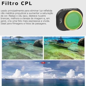 Filtro de lente cpl para drone dji mini 4 pro Filtro de lente cpl para drone dji mini 4 pro O filtro cpl da sunnylife foi projetado especificamente para o drone dji mini 4 pro, têm como principais funções eliminar a luz não metálica refletida e que pode acabar prejudicando as imagens, aumentar a concentração de cores para realçar o azul do céu, destacar as nuvens brancas e tornar a imagem mais impressionantes. Ele também consegue melhorar a claridade das imagens e, em geral, criar fotos e vídeos mais expressivos e vívidos. É frequentemente para fazer imagens através de vidro, água e cenários subaquáticos. O cpl pode ser ajustado e a moldura dourada pode ser girada de acordo com suas necessidades para atingir requisitos de polarização satisfatórios, sendo indicado para para céus, águas e folhagens. Além de melhorar a sua experiência ao fotografar e filmar, o filtro também fornece proteção extra para a câmera do drone, pois a sua estrutura é feita de liga de alumínio, com design antiderrapante para facilitar ainda mais a instalação e a remoção. E seu design ultraleve não sobrecarrega o gimbal. Também conta com revestimento multicamada de dupla face que garante um protetor à prova d&39;água, à prova de óleo, à prova de poeira e anti-riscos de primeira classe, dando a você a liberdade de experimentar diferentes possibilidades criativas. Melhore drasticamente esses elementos naturais, dando às imagens uma aparência melhor Principais vantagens: - leve - prático - fácil de instalar/remover - proteção extra Modo de usar: 2. Alinhe com os orifícios e gire o filtro no sentido horário 3. Pronto Dados técnicos: Marca: sunnylife Modelo: n4p-fi724 Material: alumínio + vidro óptico Peso da embalagem: 0.7g Compatibilidade: Compatível com drone dji mini 4 pro Itens inclusos: 1x filtro de lente cpl 1x caixa de transporte Drone não incluso Imagens meramente ilustrativas de 90 dias após o recebimento do produto Esta é válida para todo o território nacional, e ela cobre defeitos de fabricação. Para maiores informações consulte o site do fabricante ou contate-nos pelos nossos canais de atendimento. Por que comprar seu equipamento com a proaventura