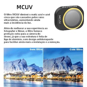 Filtro de lente mcuv para drone dji mini 4 pro Filtro de lente mcuv para drone dji mini 4 pro Com o filtro mcuv da sunnylife feito especificamente para o dji mini 4 pro, você conseguirá melhorar ainda mais a qualidade das suas fotos e vídeos, pois ele reduz a quantidade de luz e permite com que a câmera selecione o valor de exposição correto, evitando a superexposição. Além disso, o filtro mcuv diminui o matiz azul e azul cinza que são causados pelo raio ultravioleta, aumentando ainda mais a incidência da luz. Além de melhorar a sua experiência ao fotografar e filmar, o filtro também fornece proteção extra para a câmera do drone, pois a sua estrutura é feita de liga de alumínio, com design antiderrapante para facilitar ainda mais a instalação e a remoção. Também conta com revestimento multicamada de dupla face que garante um protetor à prova d&39;água, à prova de óleo, à prova de poeira e anti-riscos de primeira classe, dando a você a liberdade de experimentar diferentes possibilidades criativas Principais vantagens: - fácil instalação - fácil remoção - material resistente - proteção extra Modo de usar: 2. Alinhe com os orifícios e gire o filtro no sentido horário 3. Pronto Dados técnicos: Marca: sunnylife Modelo: n4p-fi721 Material: alumínio + vidro óptico Peso: 0.7g Compatibilidade: Compatível com drone dji mini 4 pro Itens inclusos: 1x filtro de lente mcuv 1x caixa de transporte Drone não incluso Imagens meramente ilustrativas de 90 dias após o recebimento do produto Esta é válida para todo o território nacional, e ela cobre defeitos de fabricação. Para maiores informações consulte o site do fabricante ou contate-nos pelos nossos canais de atendimento. Por que comprar seu equipamento com a proaventura Marca: Não Informado