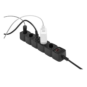 Design Otimizado para Conexões: As 5 tomadas em disposição diagonal permitem o encaixe de plugues volumosos sem bloquear as entradas adjacentes, maximizando o uso de todas as conexões.