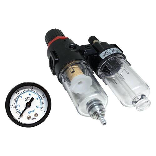 Especificações técnicas: - Dimensões: 50 x 88 x 152 mm - Peso: 0,330 kg - Tamanho da rosca: 1/4 - Vazão: 500l/min - Pressão: 0 a 0,8 mpa - Pressão máxima: 1,5 mpa - Pressão de regulagem: 0,05 a 0,8 mpa - Temperatura operacional: 5 a 60°C - Precisão do filtro: 40 micras - Capacidade do filtro: 15 cm - Capacidade do lubrificador: 25 cm - Material do copo: policarbonato