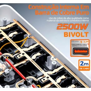 2 metros, proporcionando flexibilidade para alcançar tomadas distantes e organizar seus dispositivos de maneira prática.8 tomadas regulares para conectar diversos aparelhos elétricos simultaneamente.