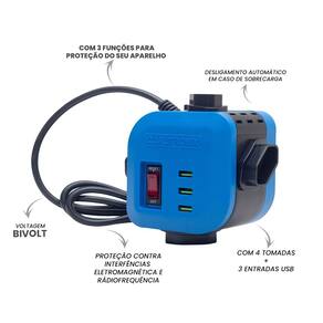 Conveniência: Com 4 tomadas e 3 portas USB, conecta múltiplos dispositivos ao mesmo tempo.