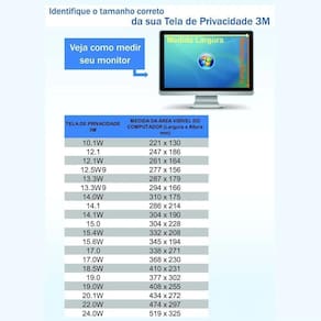Filtro de Privacidade 19,5 W9 HB004389142 3MNotebooks vieram para modernizar a vida cotidiana, eles oferecem toda a tecnologia dos desktops, porém com a vantagem da mobilidade, mas se por um lado temos a liberdade de usá-los em qualquer lugar, por outro temos o inconveniente de ter pessoas observando o que é feito no computador.O Filtro de Privacidade protegerá suas informações confidenciais através de uma exclusiva tecnologia, que bloqueia a visão dos dados da sua tela para pessoas que estiverem acima de um ângulo de 60º em relação ao centro do monitor.Somente a pessoa que estiver posicionada frontalmente ao notebook terá a visão perfeita, sem distorções do visor. Também protege as telas contra riscos e impressões digitais e mantém o nível de proteção de brilho-reflexo.O filtro pode ser em monitores de várias marcas e modelos. Não é necessário remover o filtro de privacidade ao fechar o notebook, para conservá-lo, basta removê-lo, colocá-lo em uma superfície lisa e limpá-lo com pano umedecido com água.Compre agora o seu Perguntas e Respostas: Como descobrir as medidas da tela do seu monitor área visível Primeiro, determine se o seu dispositivo tem uma moldura elevada ou uma tela de vidro frontal plana Essas telas têm vidro de ponta a ponta sem moldura elevada. Em seguida, meça sua tela de acordo com o tipo de tela que você possui Meça a altura e a largura da área visível da tela, certificando-se de medir dentro da moldura Meça a altura e a largura de todo o visor de vidro, certificando-se de medir de ponta a ponta Não consegue encontrar suas medidas exatas Dica de melhor ajuste: Selecione um filtro que seja maior, mais próximo de suas medidasOutras Especificações: Não distorce a imagem do monitor Bloqueia em até 60% o brilho/reflexo Glare Pode ser em monitores ou notebooks de várias marcas e modelos Protege a tela contra riscos, arranhões e impressões digitais Fácil instalação e permite que aplique e remova quantas vezes quiser Produto com simples face na cor Fumê Fácil sistema de fixação para inserção e remoção do produto. Não é preciso retirá-la quando fechar a tela do notebook Para conservá-lo, basta removê-lo, colocá-lo numa superfície lisa e limpá-lo com pano umedecido com água, seque bem e reinstaleItens Inclusos01 Filtro de privacidade01 Manual do usuário01 Pano de Limpeza01 Par de Etiquetas Destacáveis e Autoadesivas para a fixação Marca: Não Informado