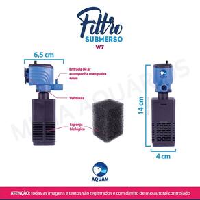 Especificações técnica: Marca: Aquam Modelo: W7 Potência: 6W Voltagem: escolha a voltagem no botão do anúncio Vazão: 600 L/h Indicado para aquários de até: 90L Medidas: 4 x 14 x 6,50 cm larg x alt x profundidade Tamanho do fio: 140 cm Peso: 161g