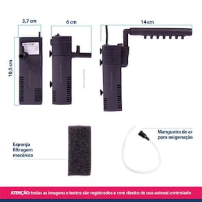 Filtro Sunsun hj-111b interno dupla filtragem com saída comum ou tipo flauta - 200L/h para aquários pequenos de até 40L Os filtros submersos Sunsun, são ideais para quem busca um equipamento prático, de fácil manutenção, confiável e de ótimo custo-benefício, possui saída tipo flauta que auxilia na oxigenação da água, realiza dois tipos de filtragem, biológica e mecânica. Características: Baixo consumo de energia Dupla filtragem Filtro esponja propicia o crescimento de bactérias para filtragem biológica e mecânica Silencioso Resistente Fácil instalação, limpeza e manutenção Possui ventosas para fixação Refil de fácil Ótimo custo benefício Saída tipo chuveirinho que auxilia na oxigenação da água Acompanha mangueira de ar para auxílio na oxigenação Acompanha dois bicos de saída: comum e saída flauta O filtro necessita ficar totalmente submerso Especificações técnica: Marca: Sunsun Modelo: Sunsun hj-111b Potência: 2W Vazão: 200 L/h Hmax: 45cm altura máxima que a bomba consegue elevar a água Indicado para aquários de até: 40L Medidas: 3,7 x 10,5 x 6cm larg x alt x profund Altura total com a flauta: 13cm. Comprimento da flauta: 11,5cm Tamanho do fio: 140 cm Peso: 147g Itens inclusos na embalagem: 1 Bomba Sunsun 1 Filtro com esponja 1 Bico de saída de água comum 1 Saída de água tipo flauta / chuveirinho 1 Mangueira de ar silicone 1 Manual em português Manutenção: Realizar a limpeza da bomba e das esponjas a cada 7 dias. Obrigado pela visita e boas compras ATENÇÃO Nossas imagens e textos são registrados e com direito de uso autoral controlado e reservado a essa loja e as lojas parceiras devidamente autorizadas em contrato. Ean: 7793299480730