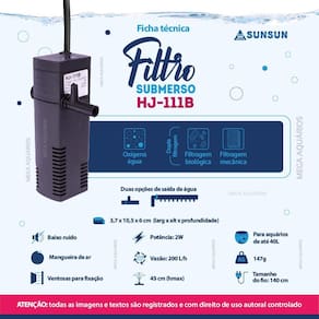 Filtro Sunsun hj-111b interno dupla filtragem com saída comum ou tipo flauta - 200L/h para aquários pequenos de até 40L Os filtros submersos Sunsun, são ideais para quem busca um equipamento prático, de fácil manutenção, confiável e de ótimo custo-benefício, possui saída tipo flauta que auxilia na oxigenação da água, realiza dois tipos de filtragem, biológica e mecânica. Características: Baixo consumo de energia Dupla filtragem Filtro esponja propicia o crescimento de bactérias para filtragem biológica e mecânica Silencioso Resistente Fácil instalação, limpeza e manutenção Possui ventosas para fixação Refil de fácil Ótimo custo benefício Saída tipo chuveirinho que auxilia na oxigenação da água Acompanha mangueira de ar para auxílio na oxigenação Acompanha dois bicos de saída: comum e saída flauta O filtro necessita ficar totalmente submerso Especificações técnica: Marca: Sunsun Modelo: Sunsun hj-111b Potência: 2W Vazão: 200 L/h Hmax: 45cm altura máxima que a bomba consegue elevar a água Indicado para aquários de até: 40L Medidas: 3,7 x 10,5 x 6cm larg x alt x profund Altura total com a flauta: 13cm. Comprimento da flauta: 11,5cm Tamanho do fio: 140 cm Peso: 147g Itens inclusos na embalagem: 1 Bomba Sunsun 1 Filtro com esponja 1 Bico de saída de água comum 1 Saída de água tipo flauta / chuveirinho 1 Mangueira de ar silicone 1 Manual em português Manutenção: Realizar a limpeza da bomba e das esponjas a cada 7 dias. Obrigado pela visita e boas compras ATENÇÃO Nossas imagens e textos são registrados e com direito de uso autoral controlado e reservado a essa loja e as lojas parceiras devidamente autorizadas em contrato.