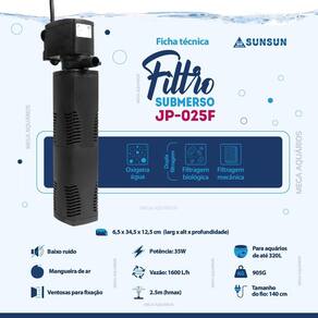 Especificações técnica: Marca: Sunsun Modelo: Sunsun JP-025F Potência: 35W Voltagem: Escolha a voltagem no anúncio próximo ao botão de comprar Vazão: 1600 L/h Hmax: 2.5m altura máxima que a bomba consegue elevar a água Indicado para aquários de até: 320L Medidas: 6,5 x 34,5 x 12,5 cm larg x alt x profund Tamanho do fio: 140 cm Peso: 905g