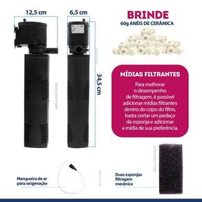 Características: Baixo consumo de energia Dupla filtragem Filtro esponja propicia o crescimento de bactérias para filtragem biológica e mecânica Auxilia na oxigenação Silencioso Resistente Possui ventosas para fixação Refil de fácil substituição Ótimo custo benefício Acompanha mangueira de ar para auxilio na oxigenação O filtro necessita ficar totalmente submerso Serve para aquário marinho e de água doce